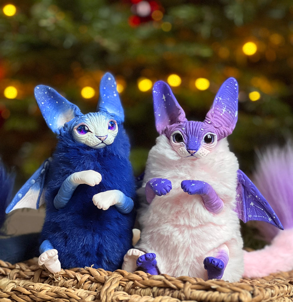 Baby batcats are the best of both worlds, they have the agility, night vision, and fluffiness of a cat while also having the wings, echolocation, and hearing of a bat. They are a mysterious kind of creature and love using their energy for all kinds of magic. The baby batcats are always guarded by a flock of adult batcats. The adult batcat can grow larger than the biggest fruit bat on Еarth. Their size and coloration depends on where they grow up and what kinds of energy they absorb. The baby batcats are mostly curious and interested in making new friends.