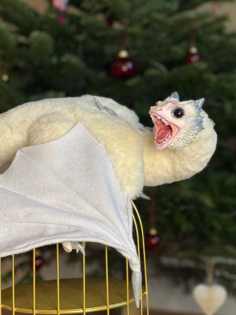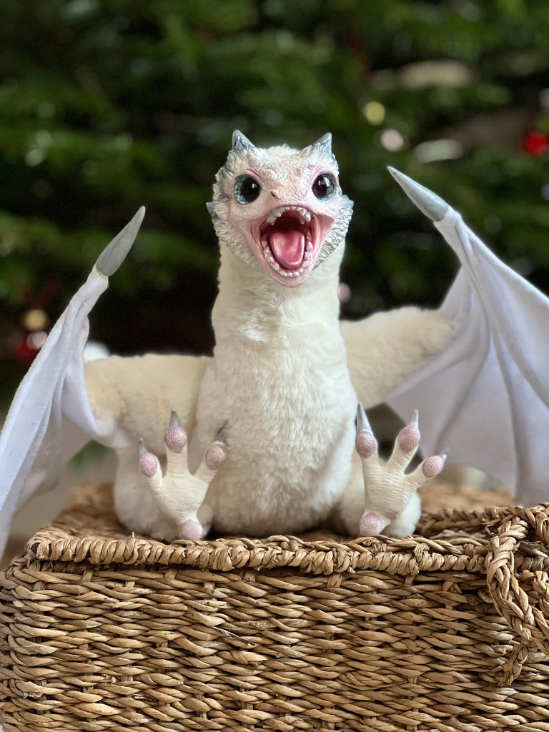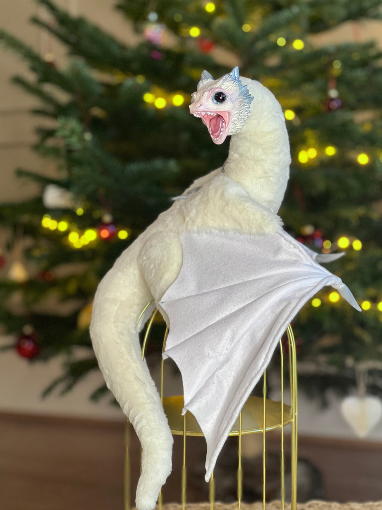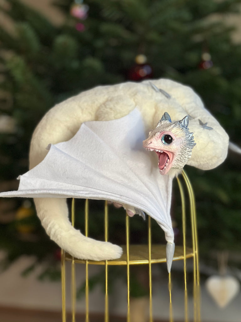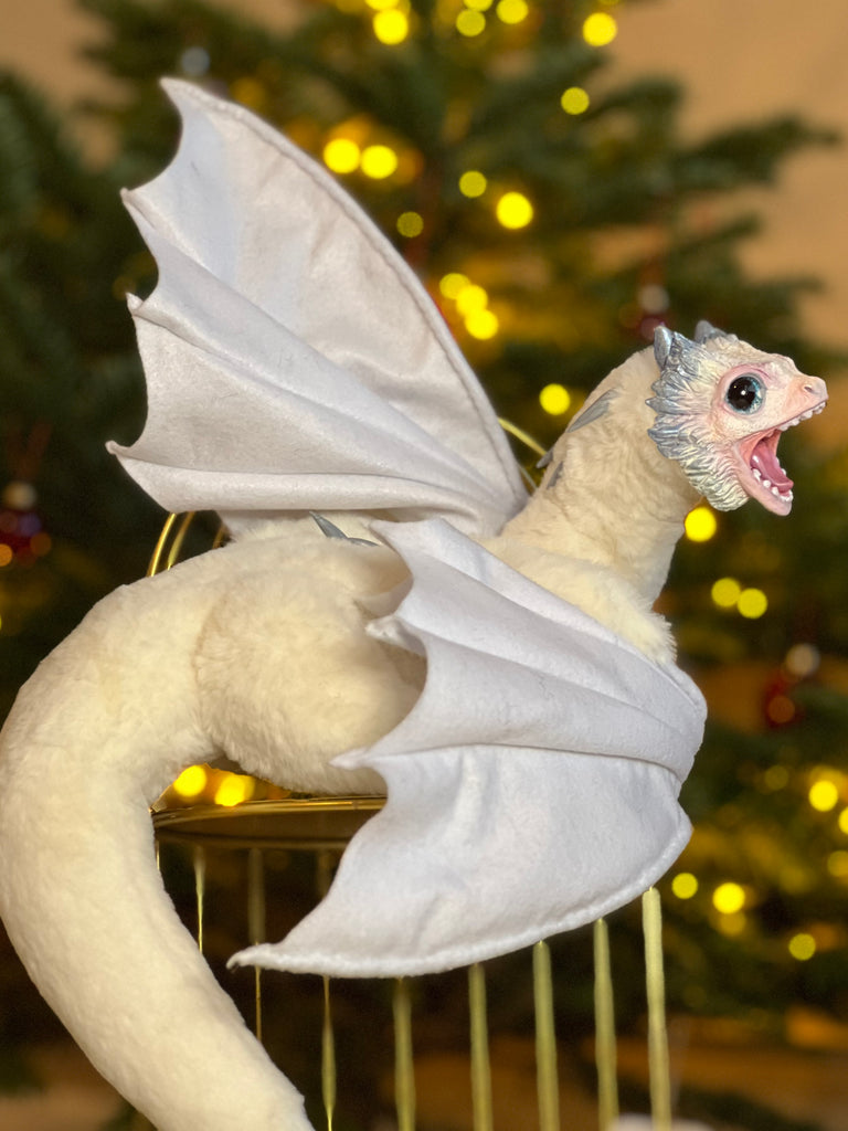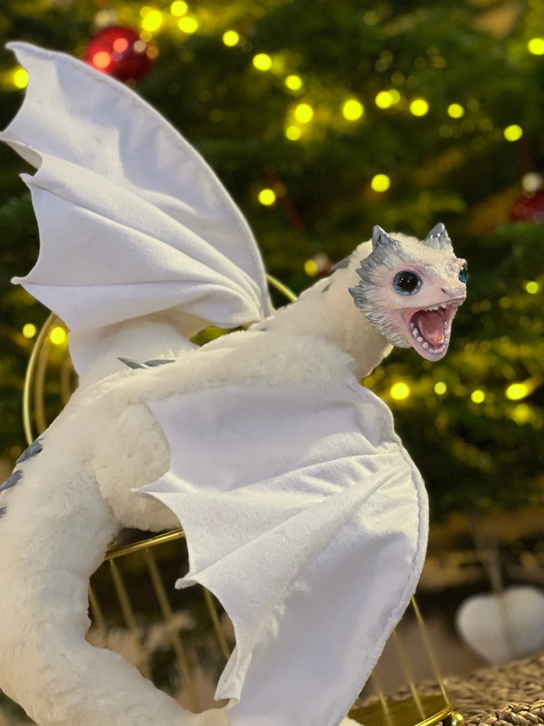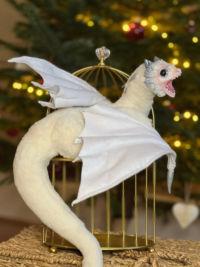Inspired by the ethereal beauty of ice and snow, this dragon embodies the elegance and mystery of mythical creatures. Its shimmering white scales and icy blue gaze evoke a world of frozen wonders, where legends come to life. Fully posable wings and limbs allow for dynamic and expressive poses, capturing its graceful yet powerful nature. This dragon is a creature of frost and air, exuding a cool, captivating aura that sets it apart in the realm of fantasy.