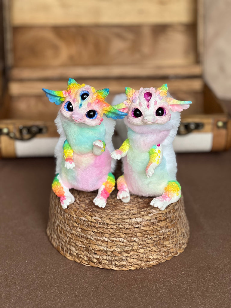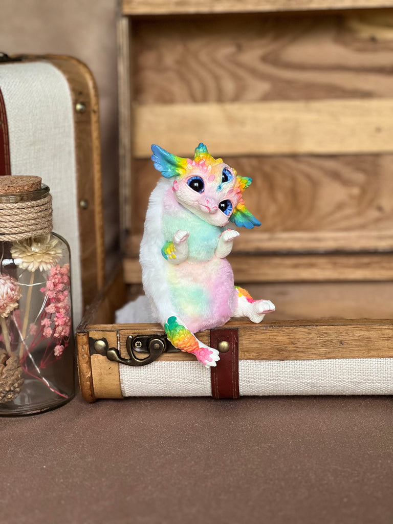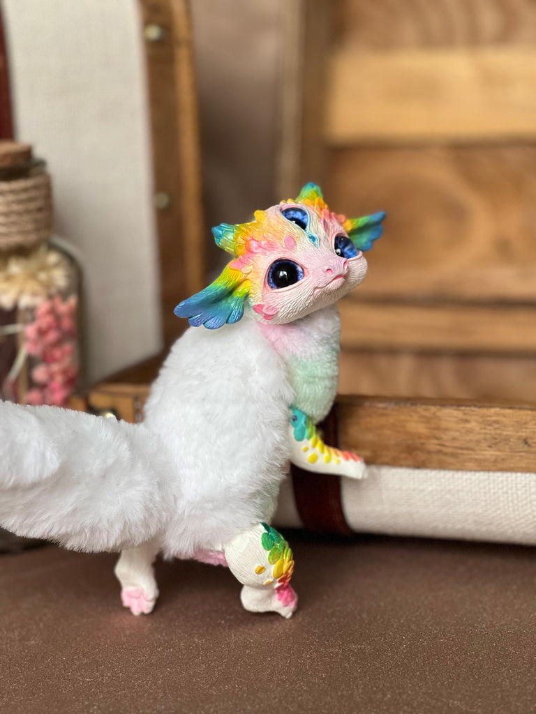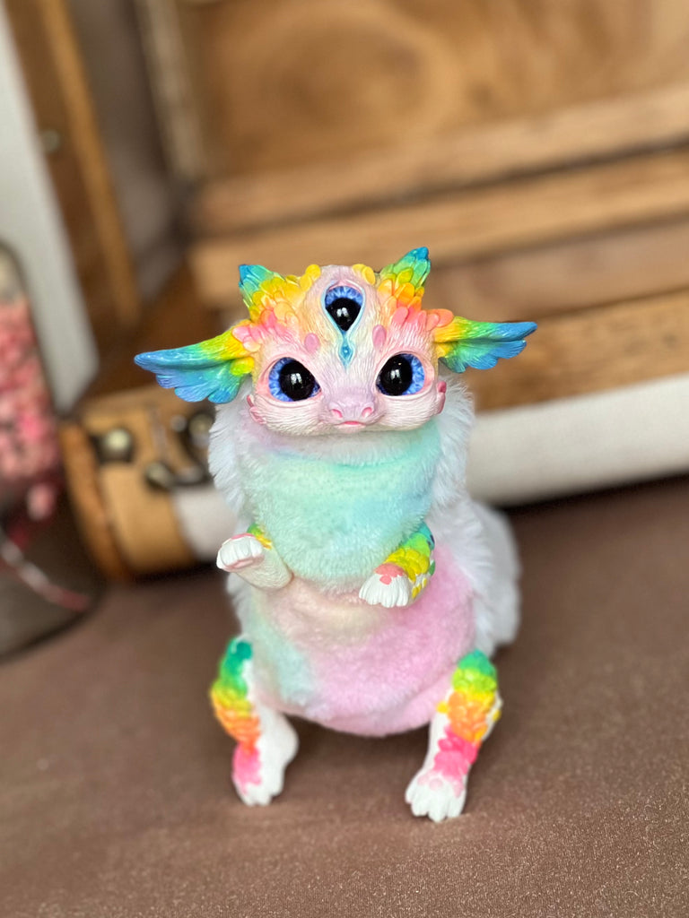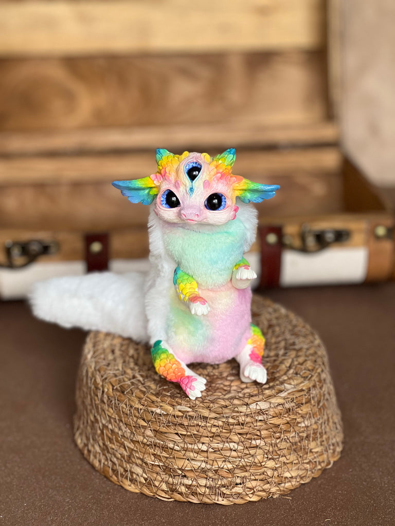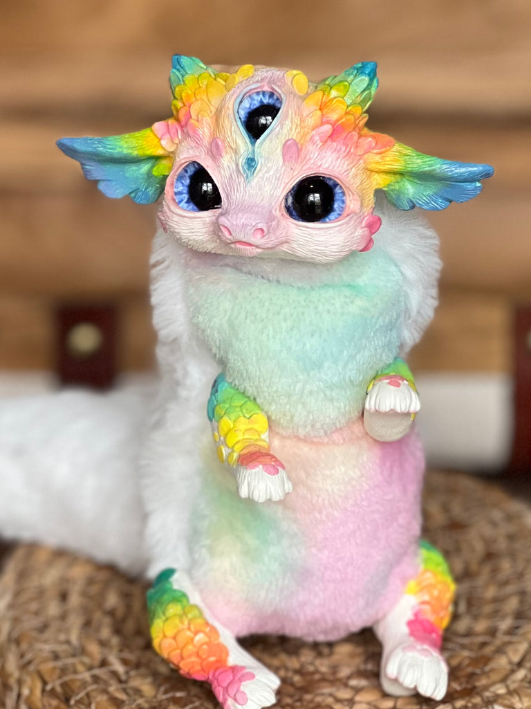 Meet our enchanting Arboreal Baby Dragon! This whimsical creature features a soft, furry body, bright rainbow accents with a fluffy white tail. Its large, expressive eyes and unique, crystalline adornments make it a captivating addition to any fantasy collection. Perfect for those who adore magical and mythical beings, this little dragon is ready to bring a touch of enchantment to your home.