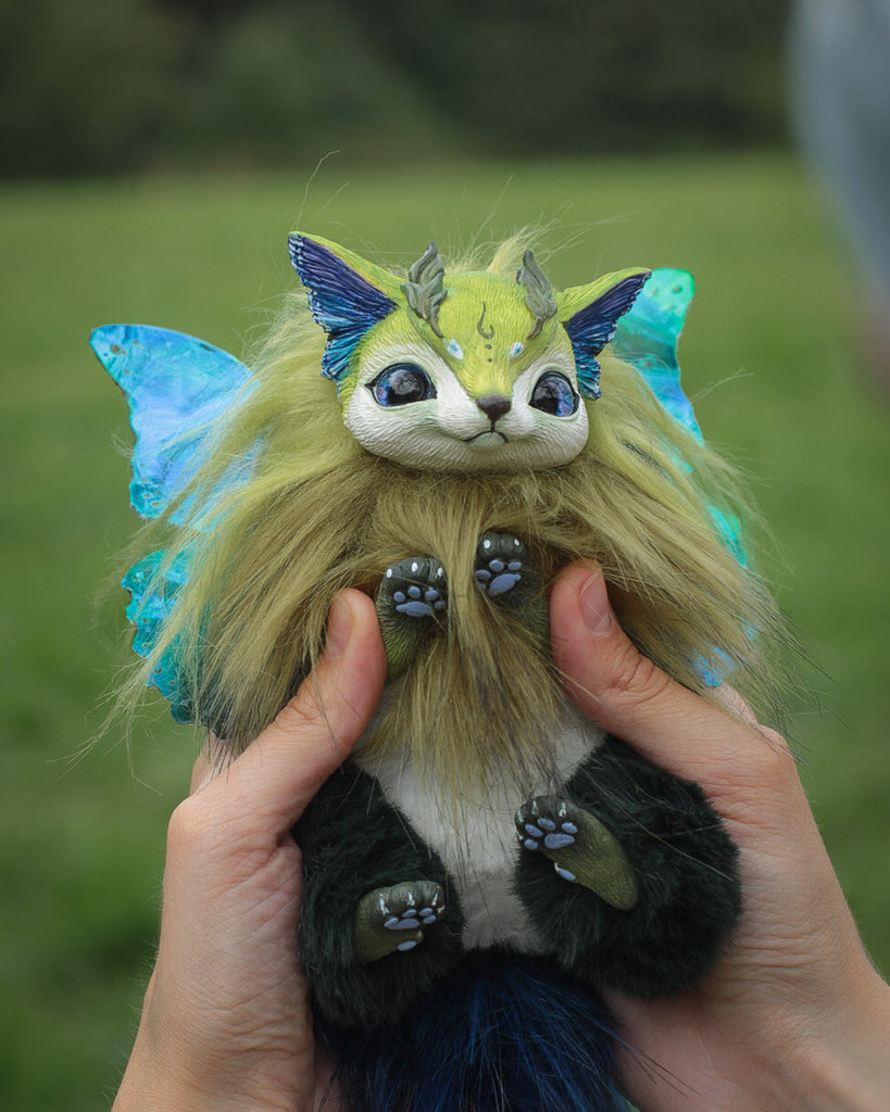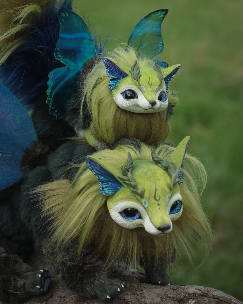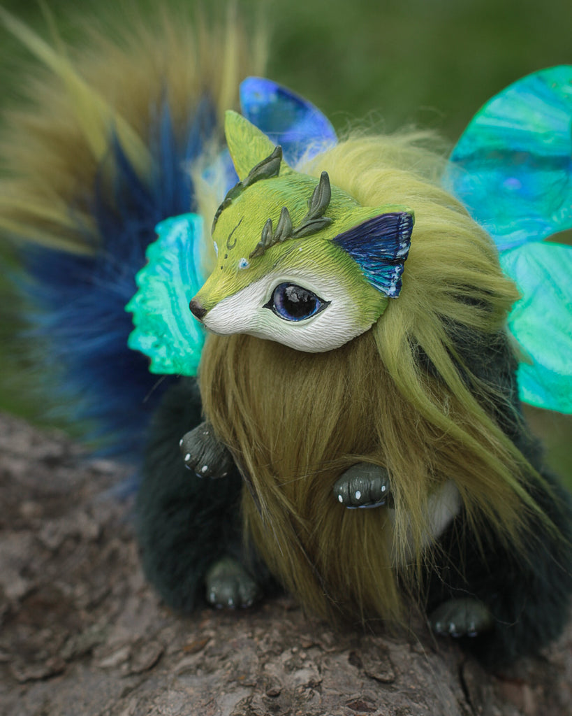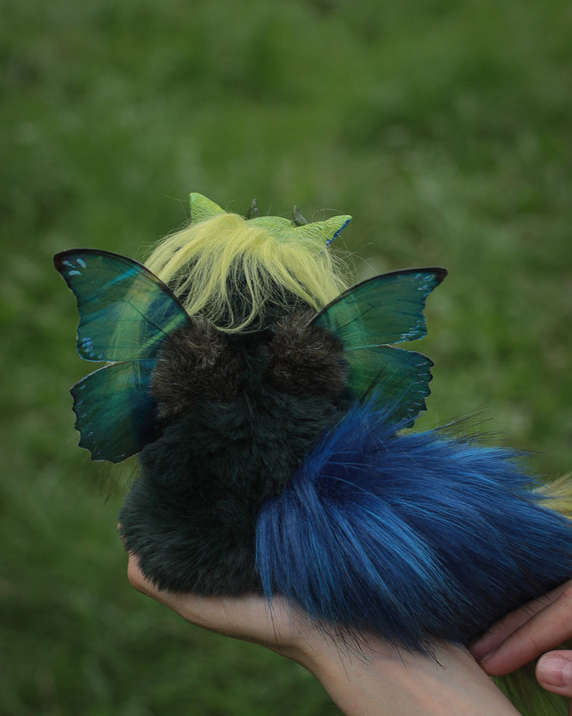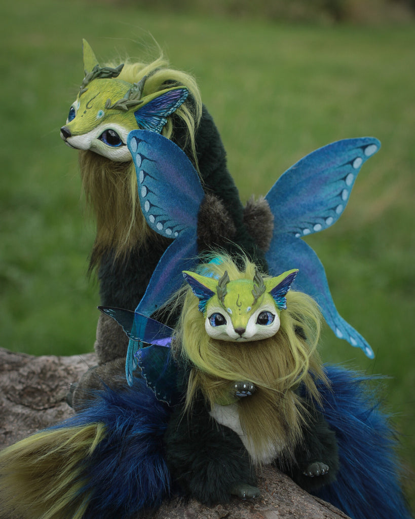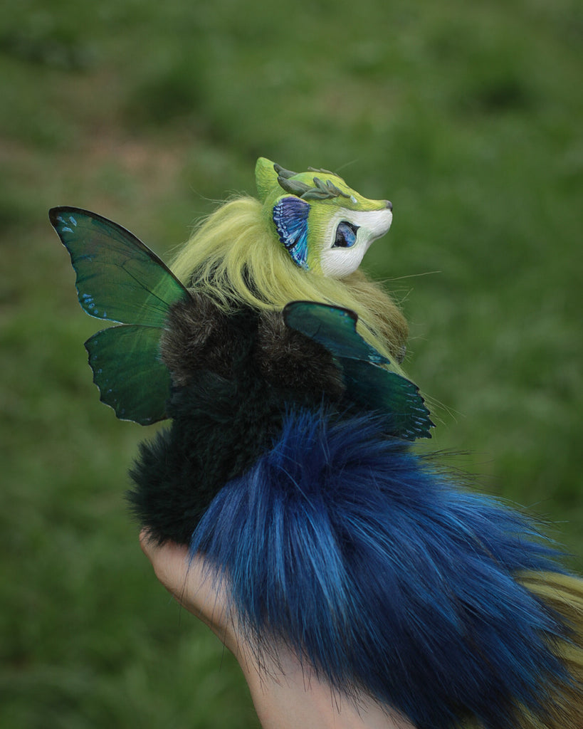 Meet the Baby Moth-Fox, a tiny marvel inspired by our fabulous Mercurian Moth-Fox.. With cute features like its parent, this mini-wonder adds new magic to your world. Its shimmering wings carry the beautiful pattern of the “ Battus philenor” butterfly. With the same adorable muzzle, delicate ears, and fluffy tail, the Baby Moth-Fox captures charm and natural wonder in a smaller captivating variant.