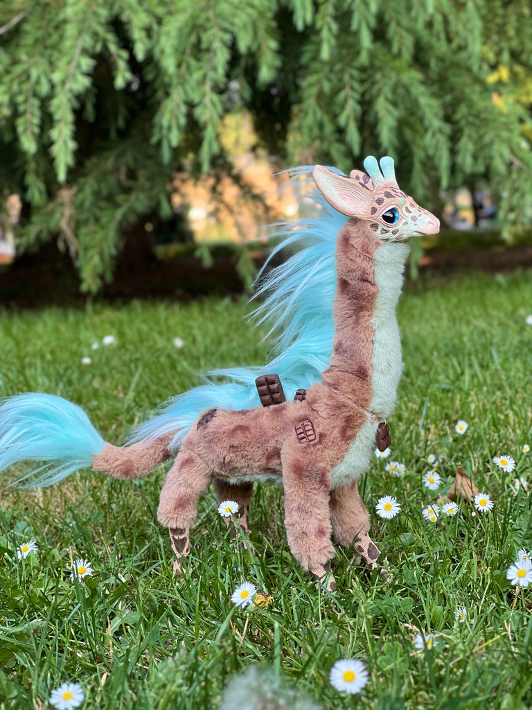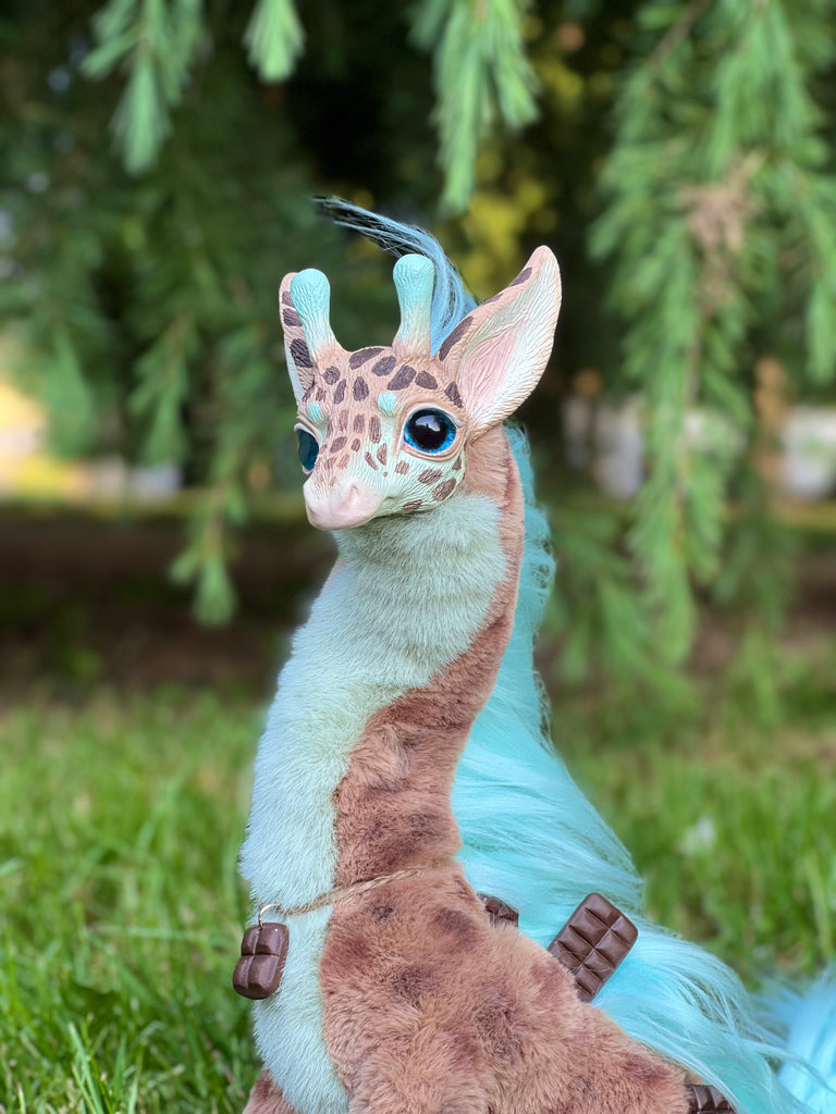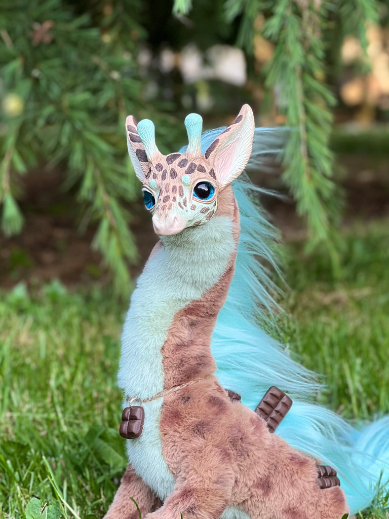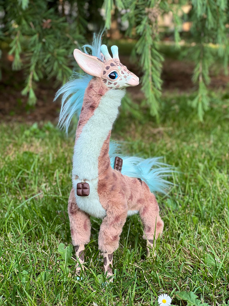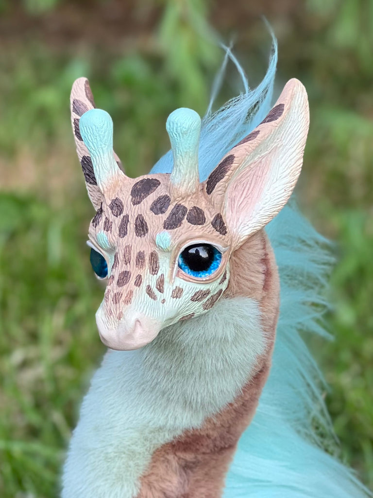 Behold the stunning Mercurian Giraffe! This otherworldly creature boasts a vibrant blue coat adorned with striking spots and a lush, flowing mane. With its elegant, elongated neck and expressive eyes, this fantastical giraffe exudes an aura of enchantment and mystery. Perfect for collectors and fantasy enthusiasts alike, the Mercurian Giraffe will surely captivate your imagination and add a touch of celestial charm to your collection.
