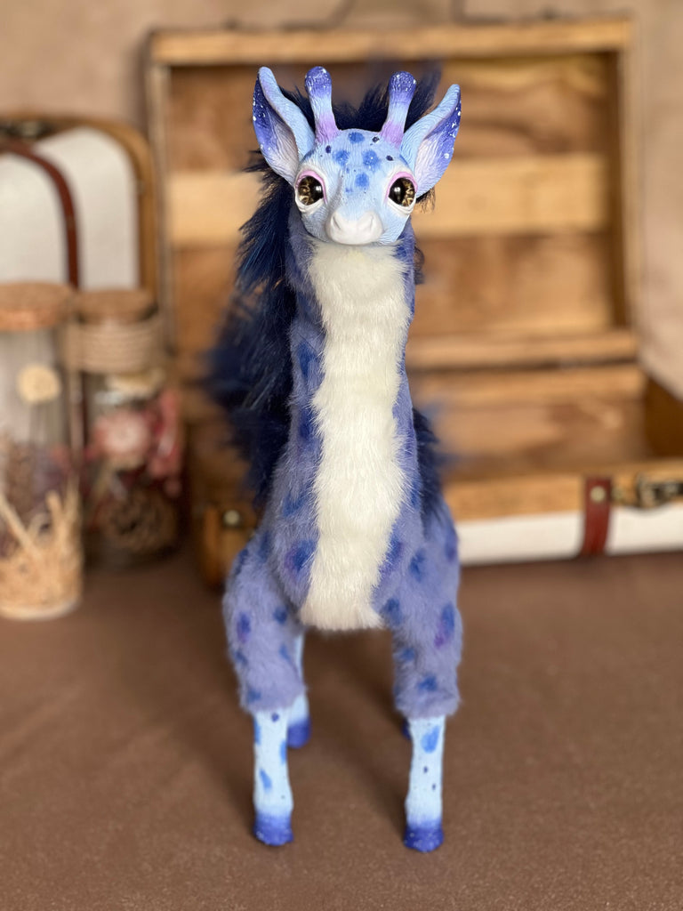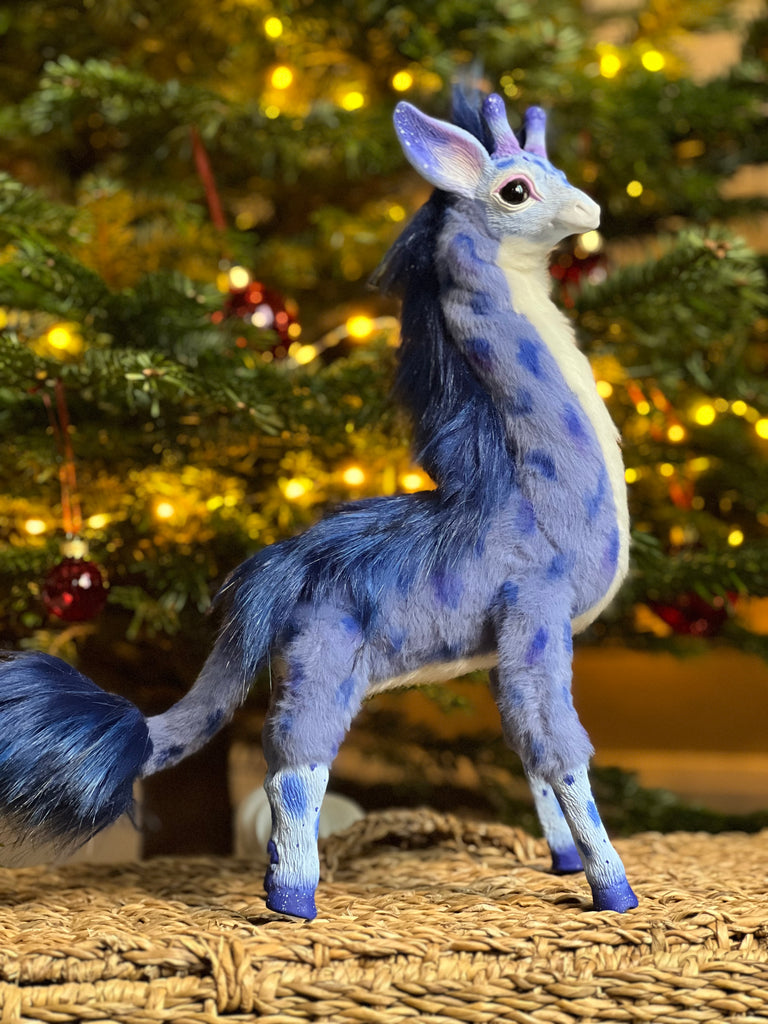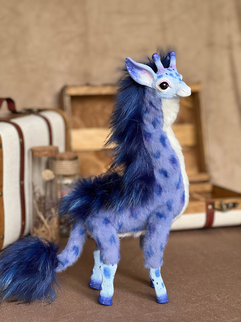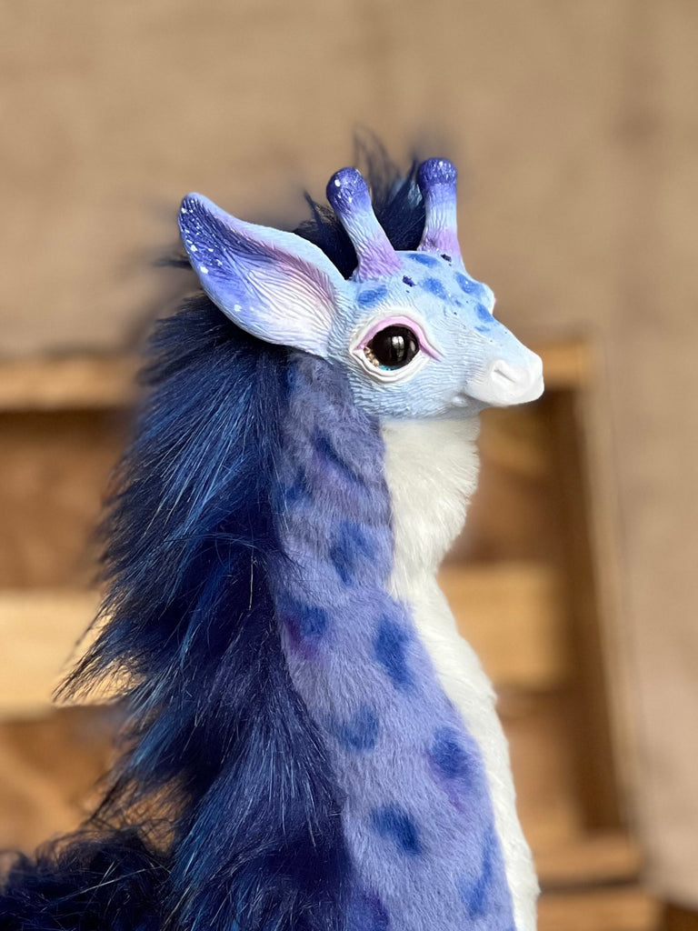 Behold the stunning Mercurian Giraffe! This otherworldly creature boasts a vibrant blue coat adorned with striking spots and a lush, flowing mane. With its elegant, elongated neck and expressive eyes, this fantastical giraffe exudes an aura of enchantment and mystery. Perfect for collectors and fantasy enthusiasts alike, the Mercurian Giraffe will surely captivate your imagination and add a touch of celestial charm to your collection.