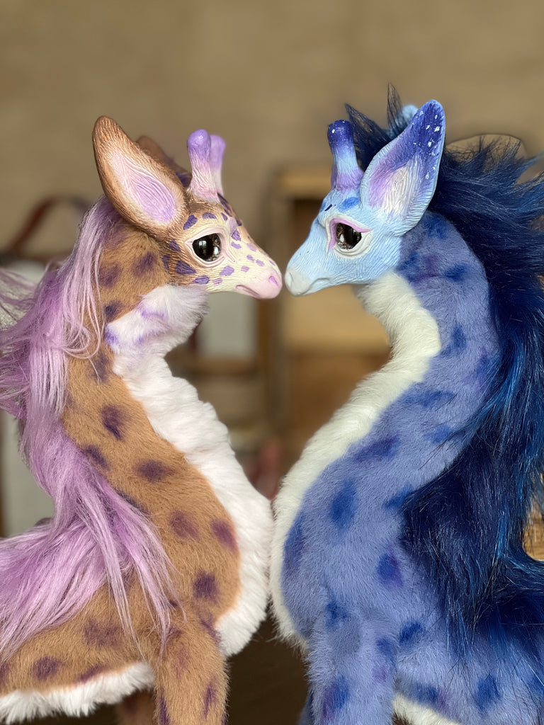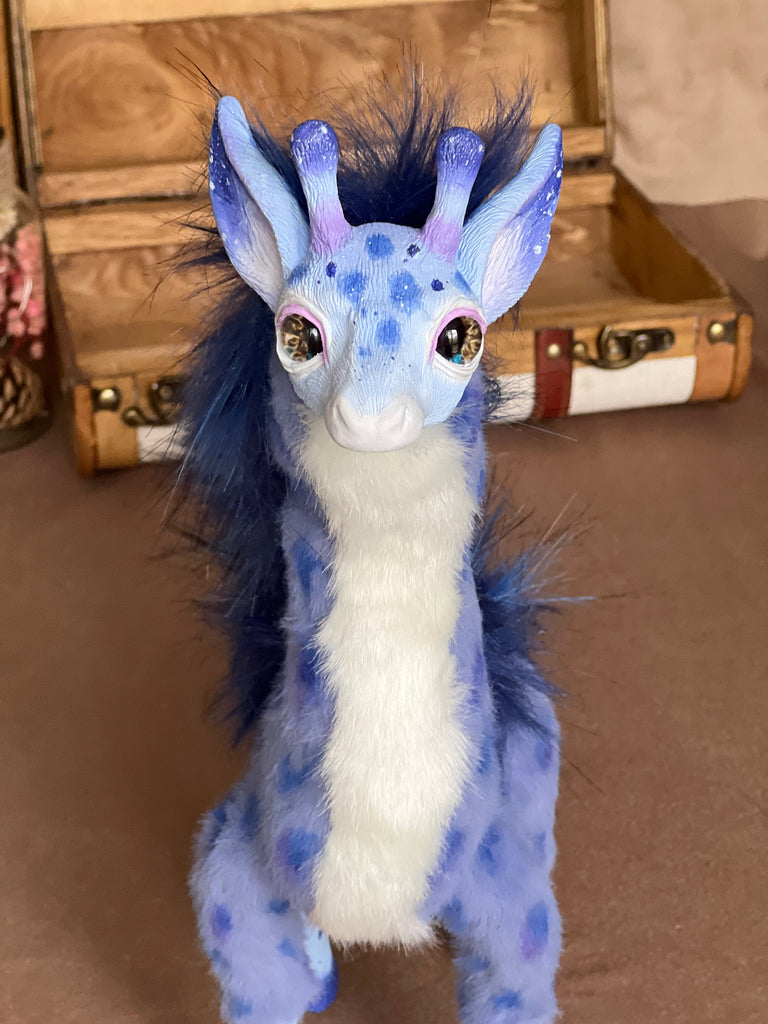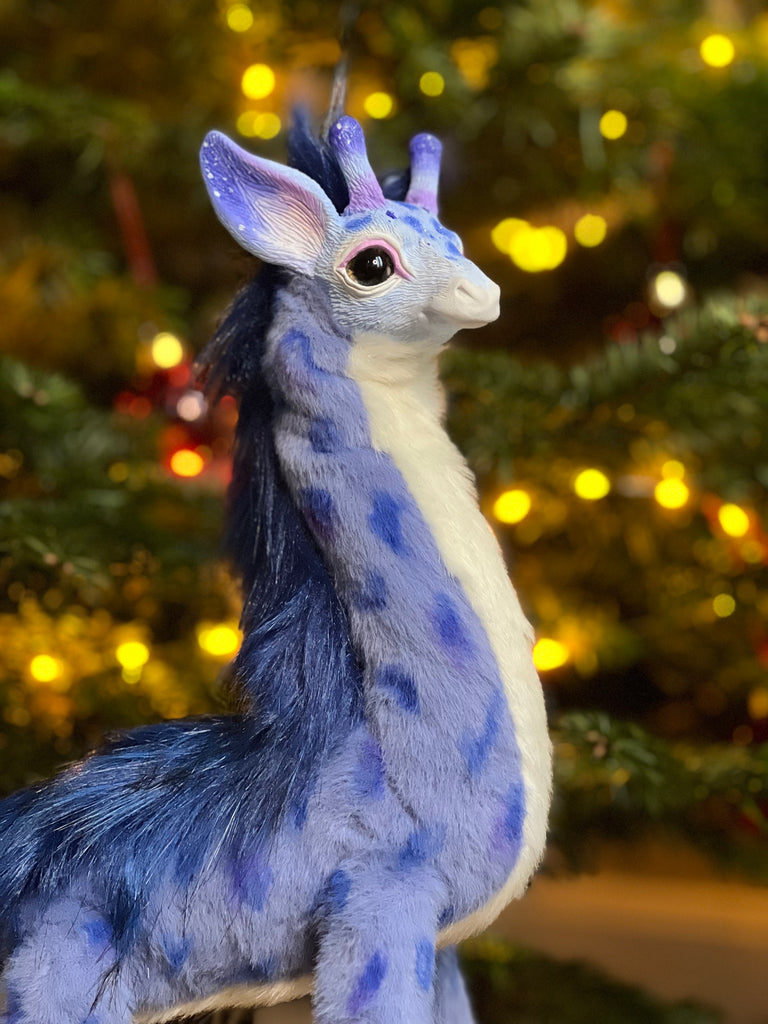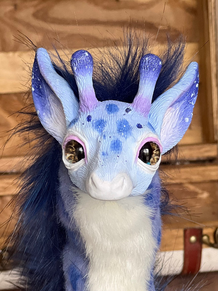 Behold the stunning Mercurian Giraffe! This otherworldly creature boasts a vibrant blue coat adorned with striking spots and a lush, flowing mane. With its elegant, elongated neck and expressive eyes, this fantastical giraffe exudes an aura of enchantment and mystery. Perfect for collectors and fantasy enthusiasts alike, the Mercurian Giraffe will surely captivate your imagination and add a touch of celestial charm to your collection.