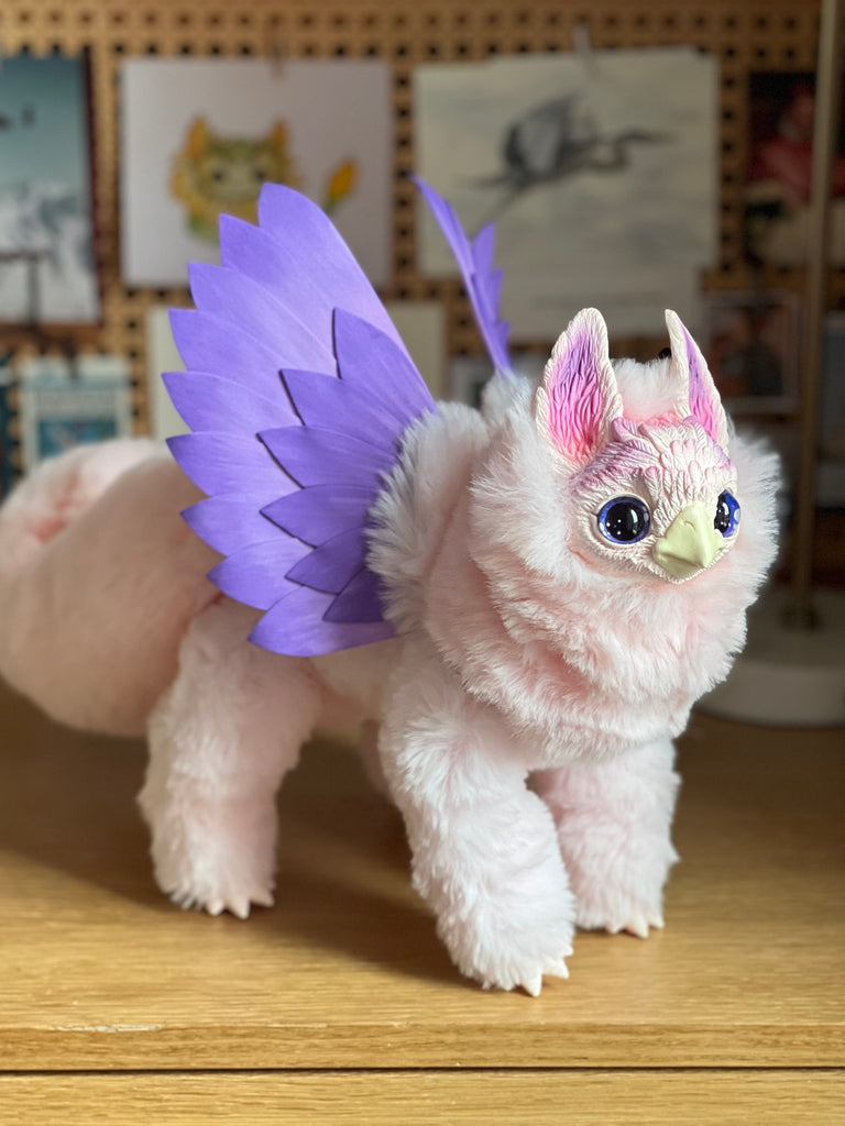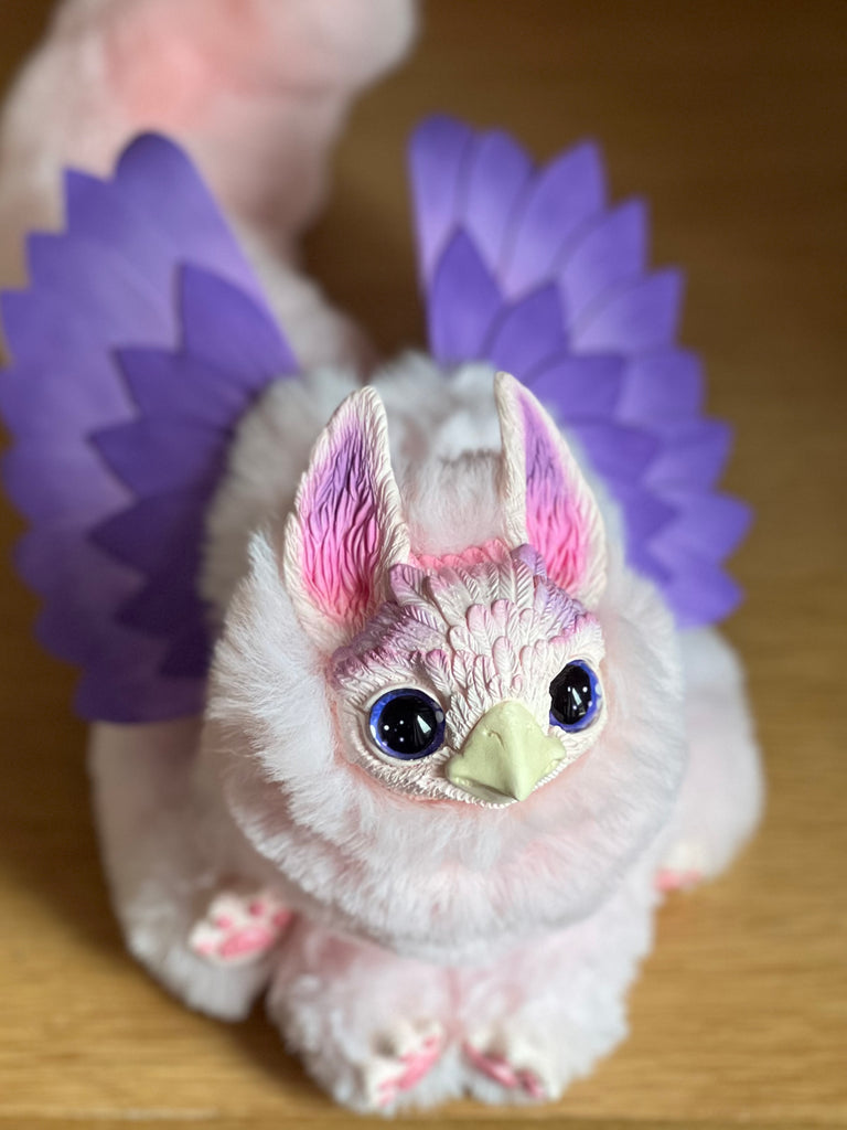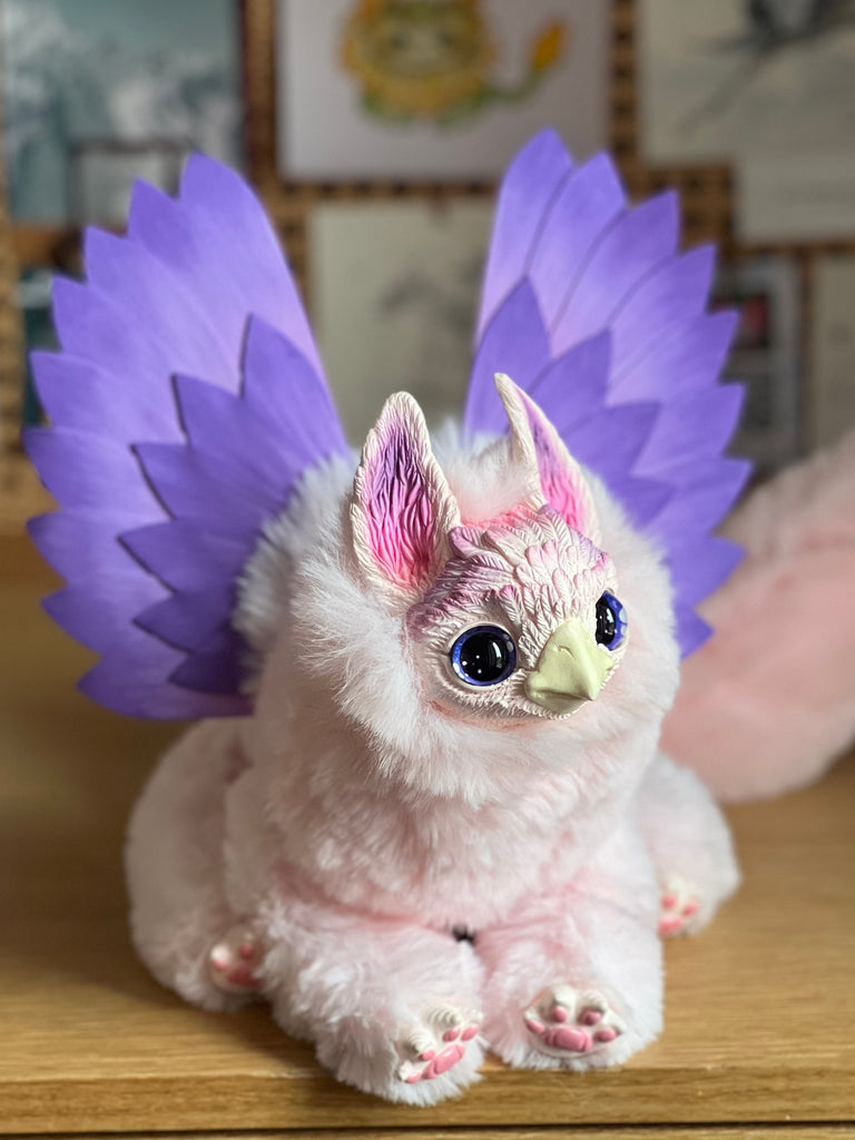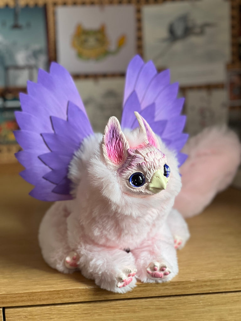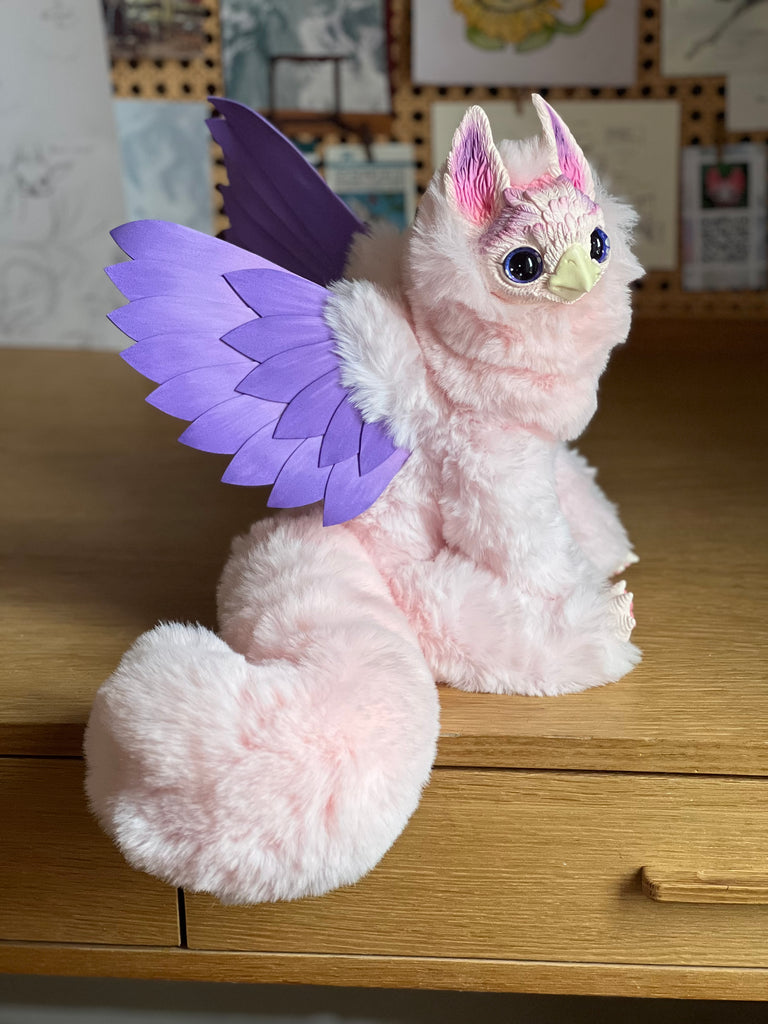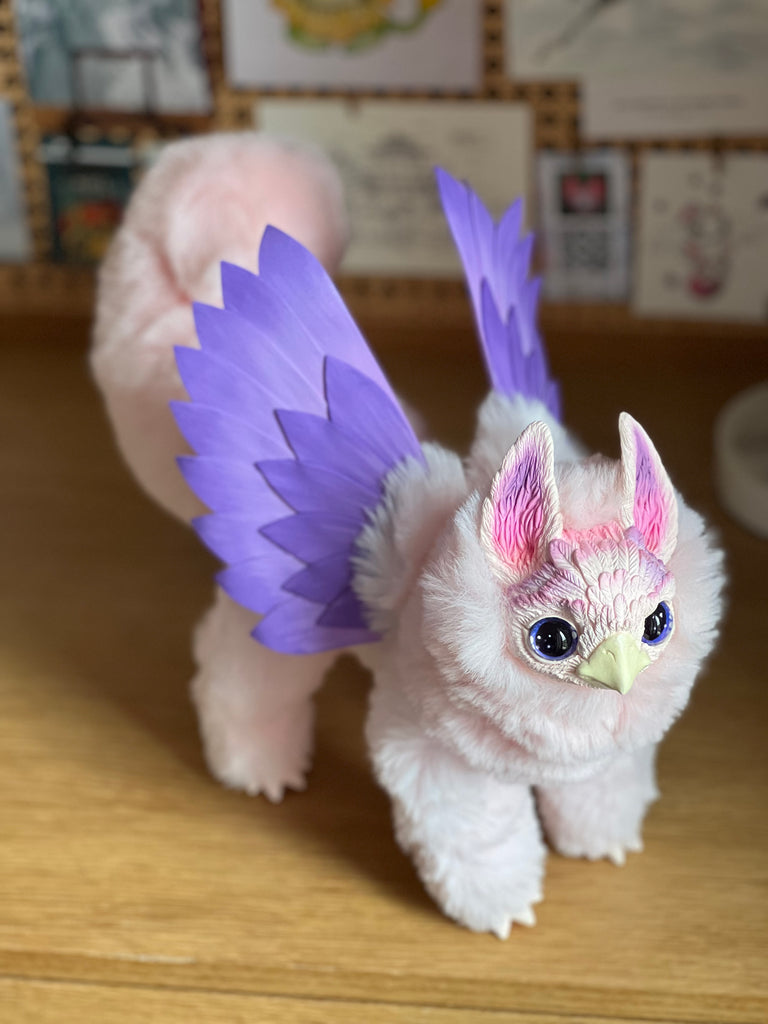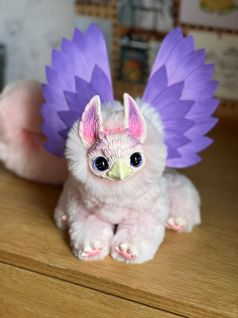 This cosmic pink pointy-eared griffin plush is a whimsical fusion of fantasy and stardust. With shimmering galaxy-themed wings, soft pastel fur blending pinks, purples, and blues, and an enchanting gaze from its oversized eyes, it looks like a magical creature plucked straight from a dream. Its fluffy body and sculpted beak add to the charm, making it a perfect companion for anyone who believes in the beauty of the mythical and the stars.