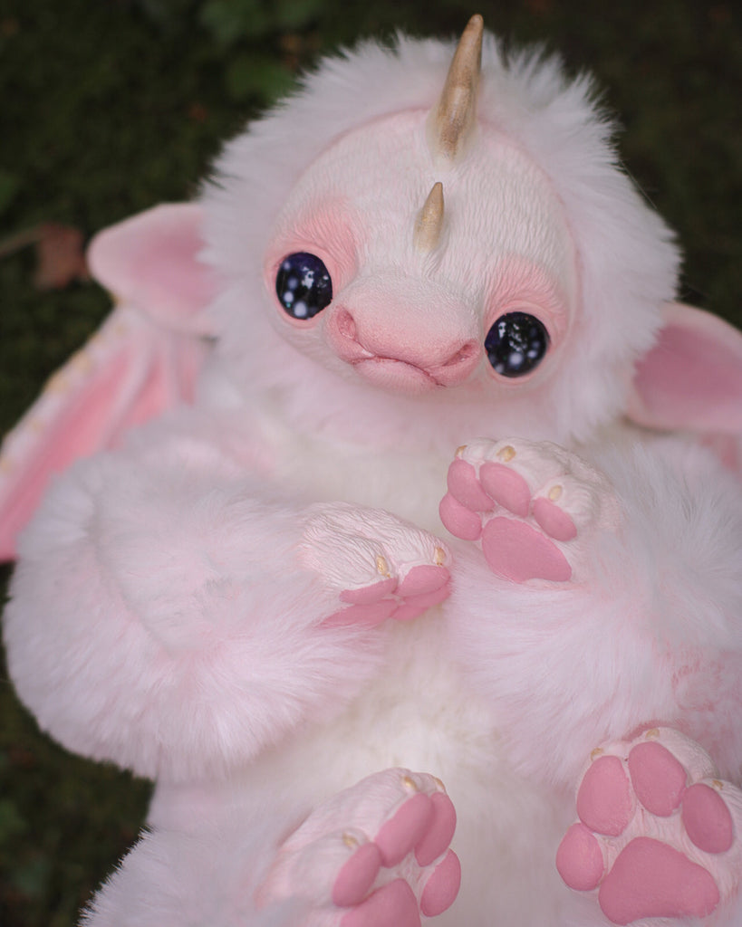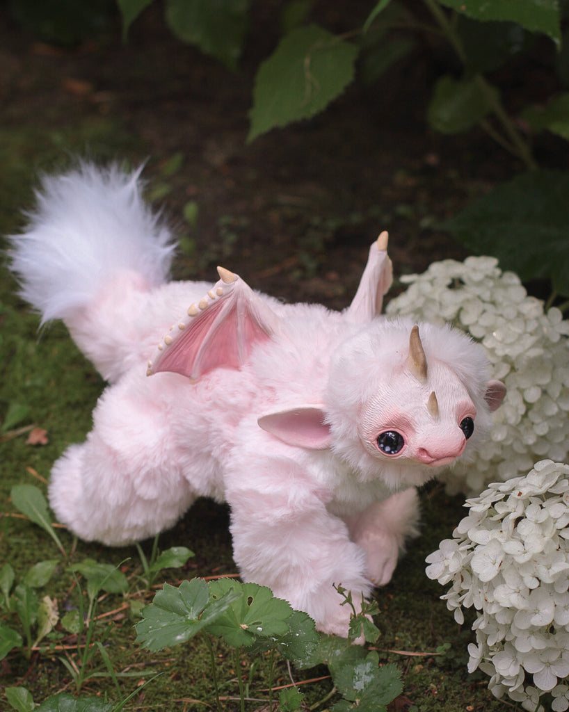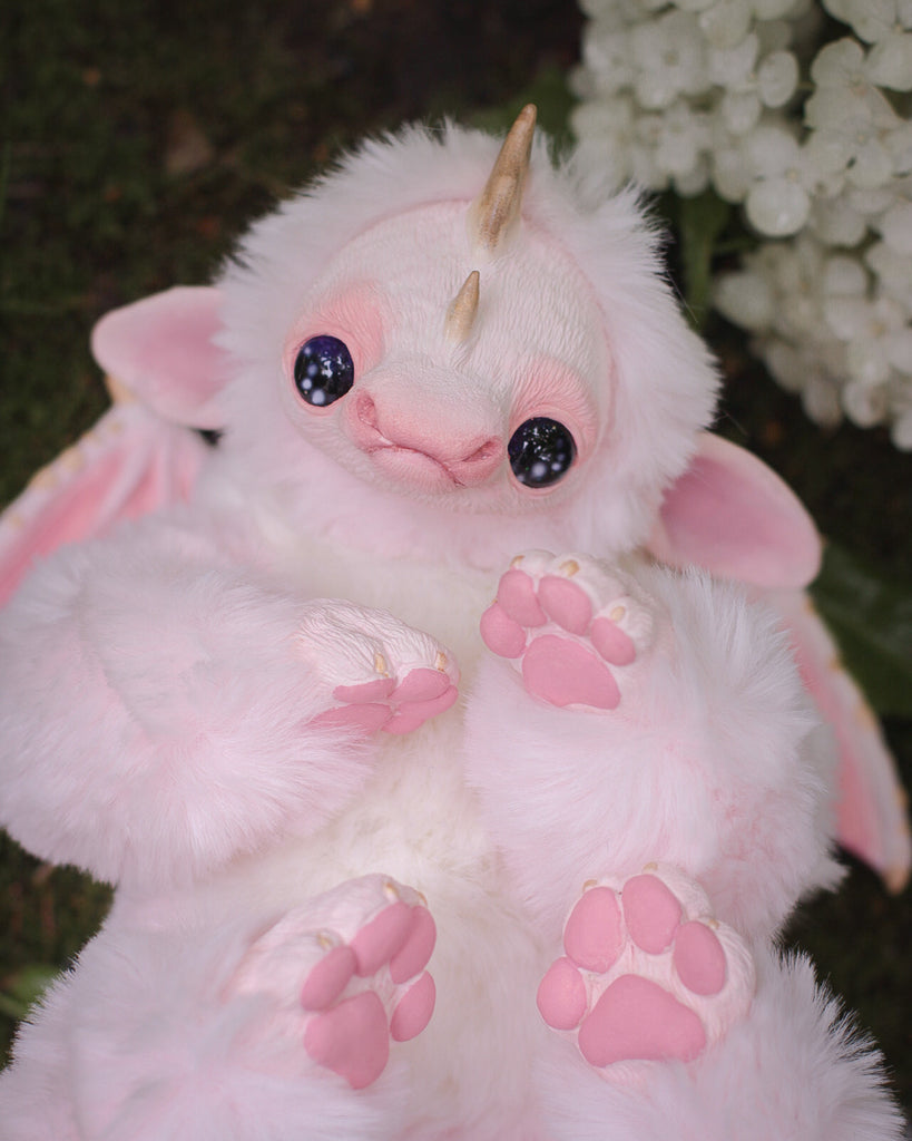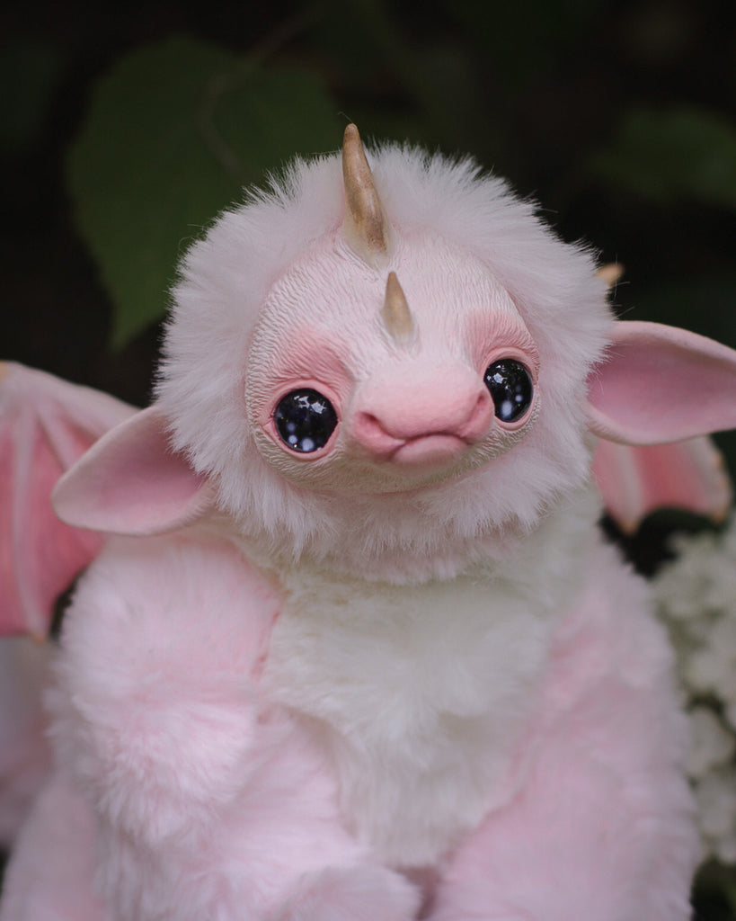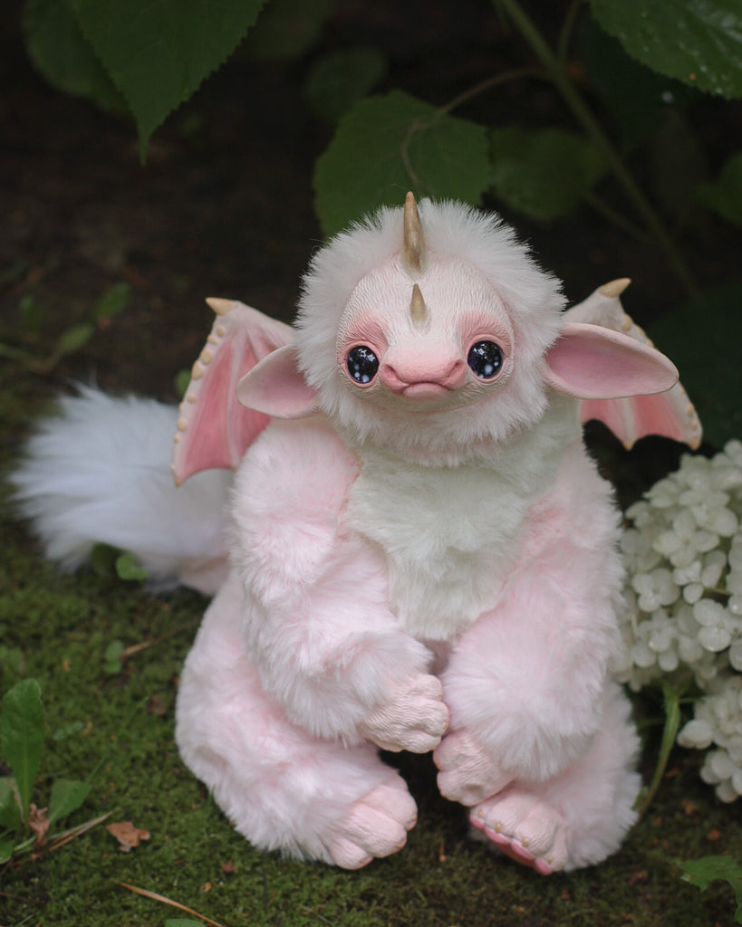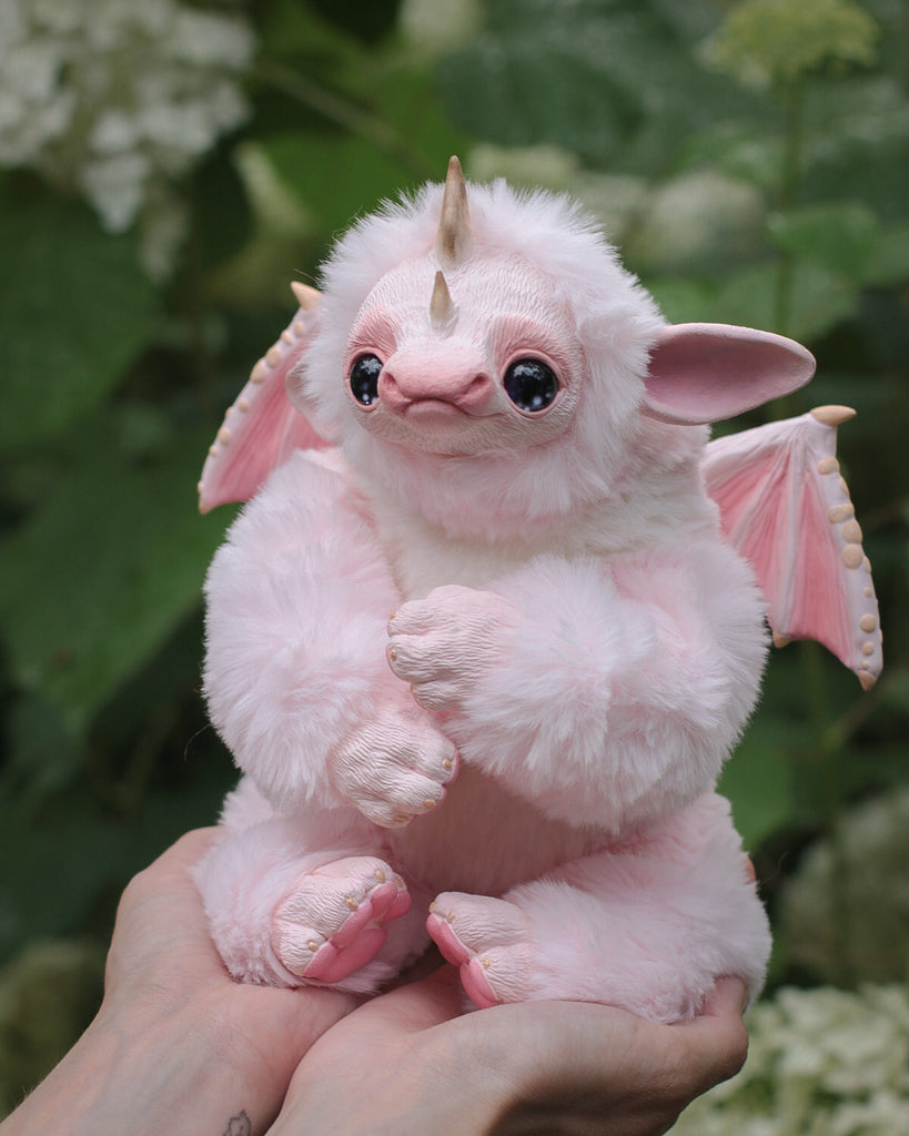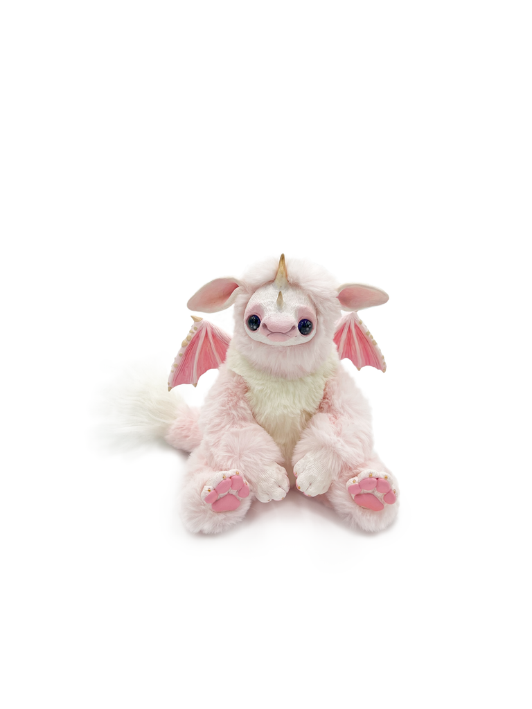 Introducing Fairhino, a pastel pink dragon that flawlessly merges the playfulness of a dragon with the irresistible charm of a rhinoceros. With its captivatingly sad eyes and enchanting features, Fairhino brings a touch of magic to your world, inviting you to embrace a unique and heartwarming companion.