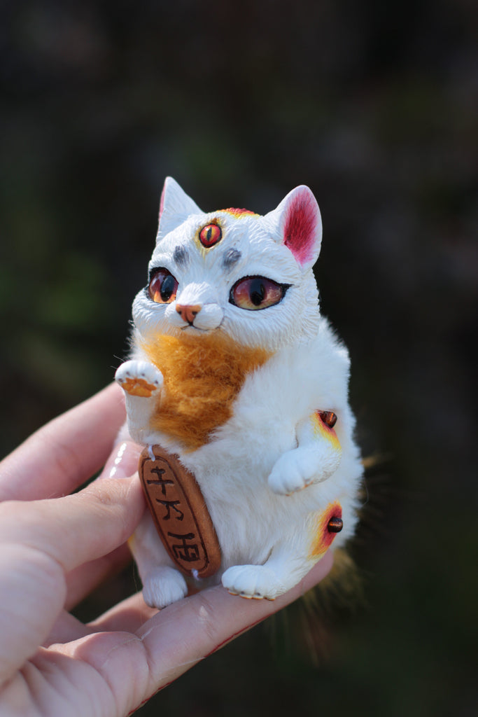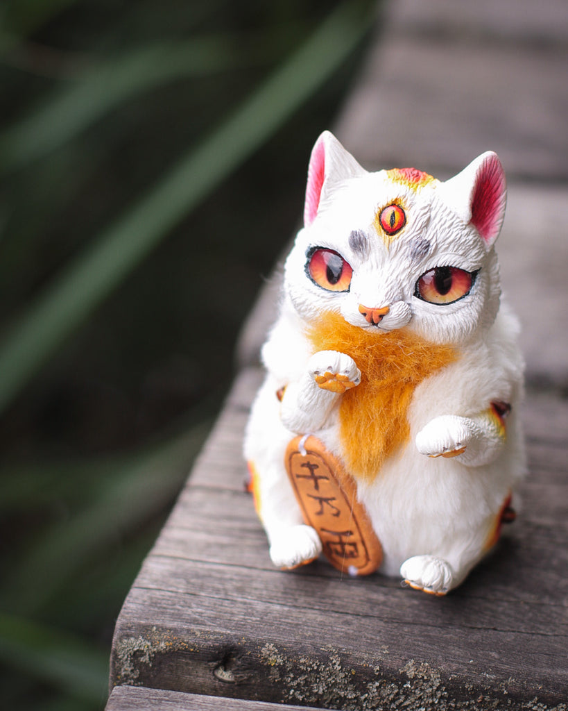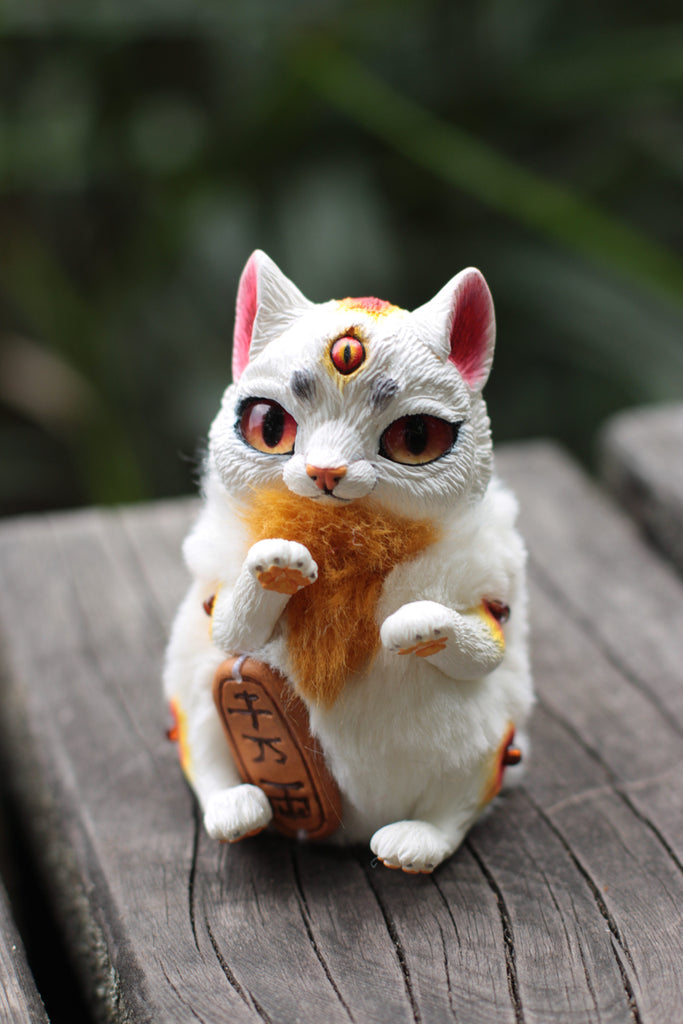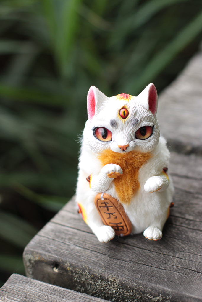 Introducing the Mercurian lucky cat, seamlessly blending cultural charm with cosmic intrigue. Adorned in iconic white-red-gold hues, this plump feline radiates prosperity. With a deep gaze guiding destinies and a mystical third eye embodying cosmic wisdom, it stands as a bridge between tradition and wonder, inviting you to embrace fortune and insight.