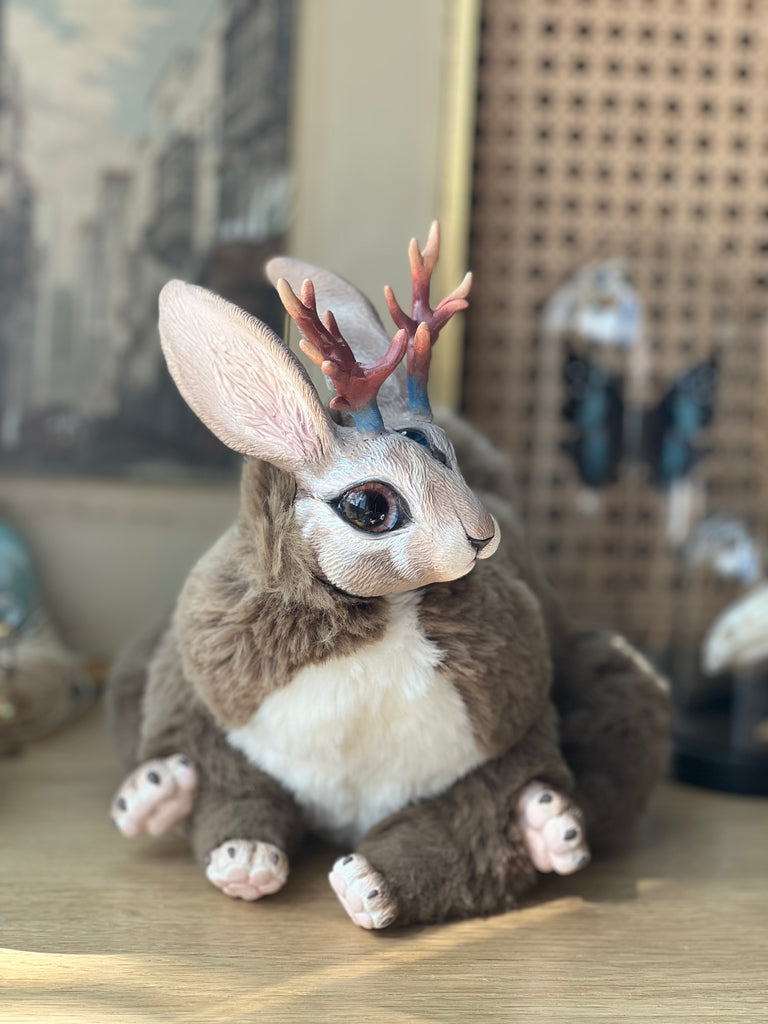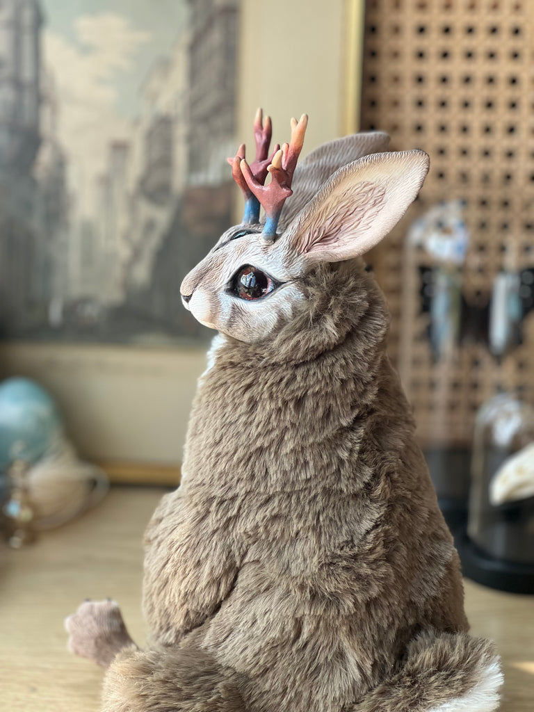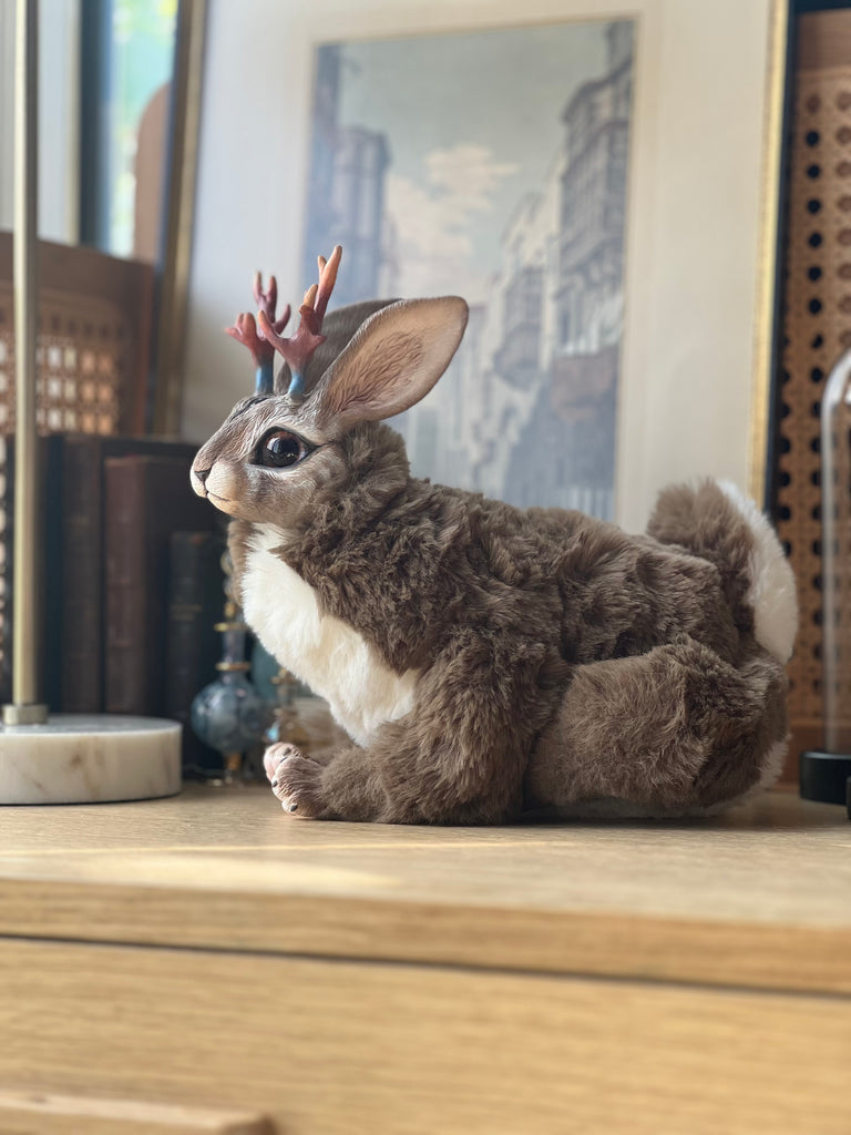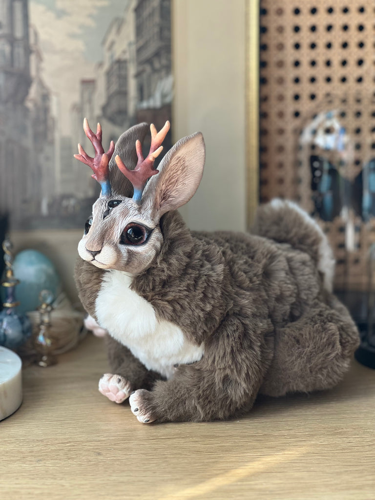 This adorable jackalope features an enchanting blend of realism and fantasy. Its soft, brown fur and lifelike eyes give it a sweet and innocent appearance, but what truly sets it apart are the whimsical antlers sprouting from its head and a mysterious third eye. The antlers, adorned with shades of blue and red, add a touch of magic, making this jackalope look like it hopped right out of a fairytale.