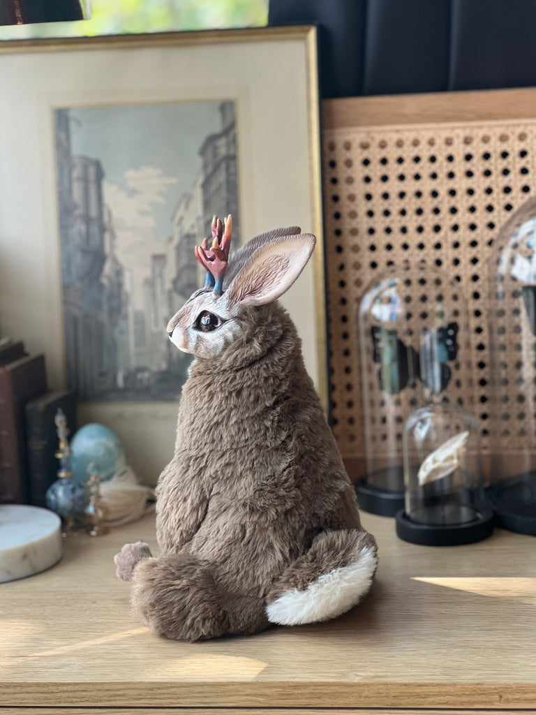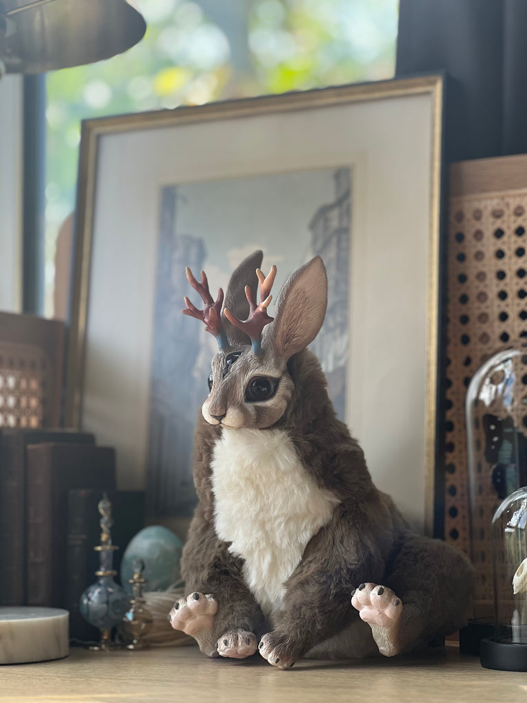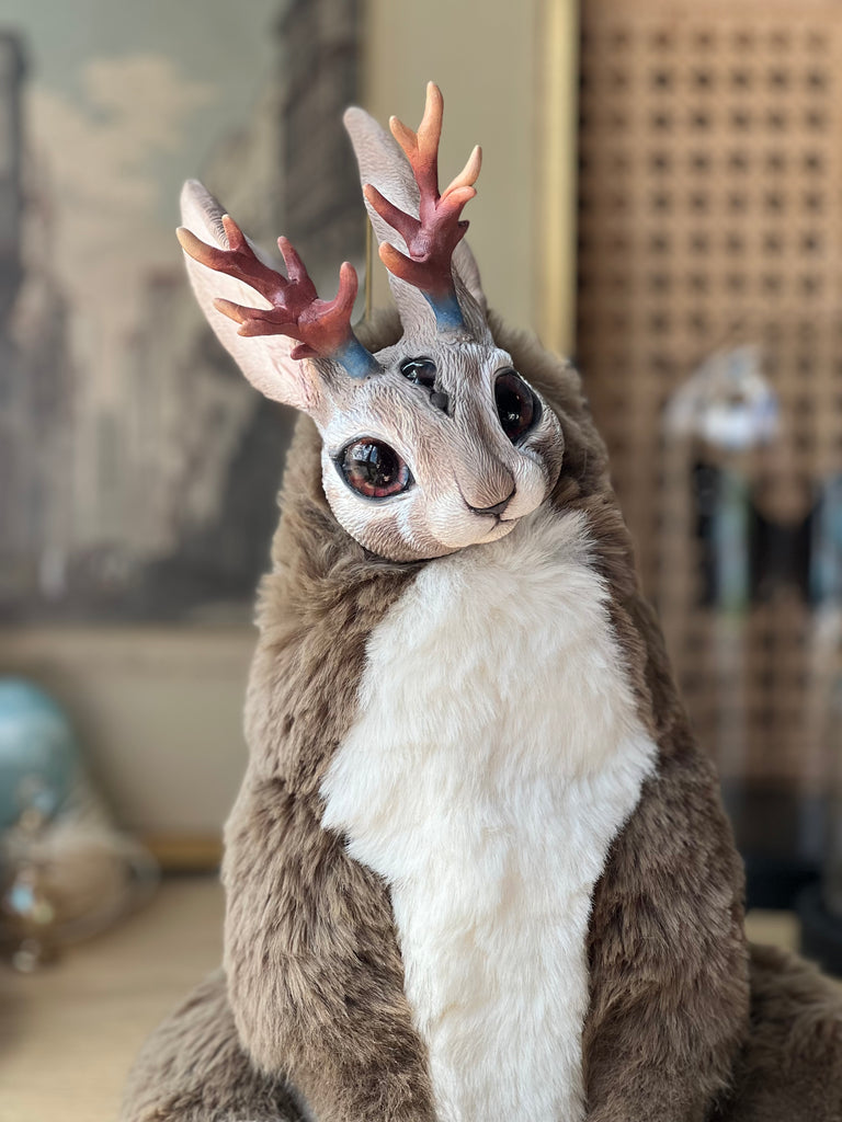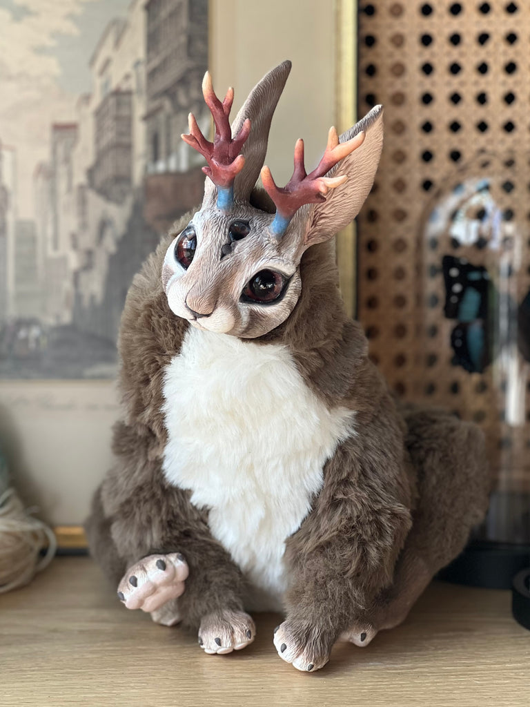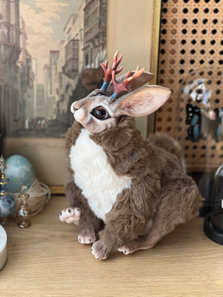 This adorable jackalope features an enchanting blend of realism and fantasy. Its soft, brown fur and lifelike eyes give it a sweet and innocent appearance, but what truly sets it apart are the whimsical antlers sprouting from its head and a mysterious third eye. The antlers, adorned with shades of blue and red, add a touch of magic, making this jackalope look like it hopped right out of a fairytale.
