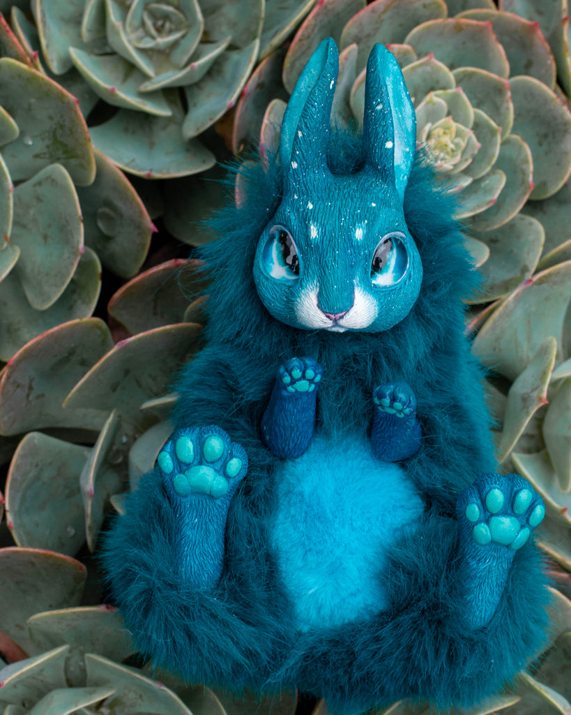 Matériaux : Squelette BJD, fausse fourrure, polyuréthane, fil de fer, sintepon, pastels, peintures acryliques, vernis.